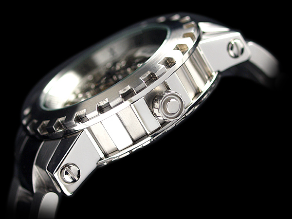 ベゼル、ケースサイドともにエッジを際立たせた仕上げを施したスケルトンモデル。すべてがメカのような一体感がありスケルトンと相まって独創的なデザインとなりました。