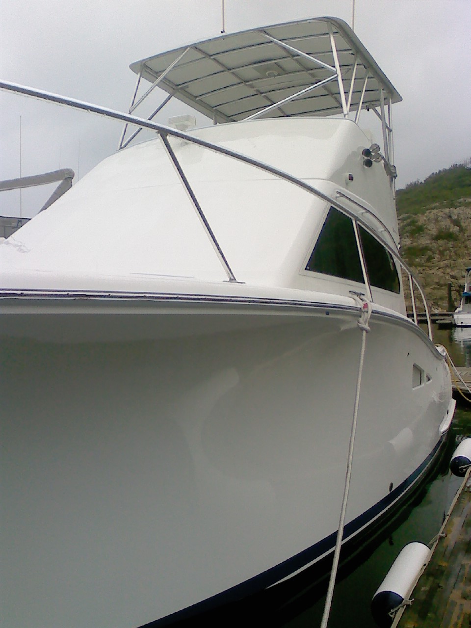 こちらが乗せてもらった船。こちらは打って変わって見たとこ手ごろな大きさ(笑)37だか38フィートと言ってたっけ?船のことはサッパリわかりませんが、釣り用の船だそうです。真っ白で綺麗だったなぁ。