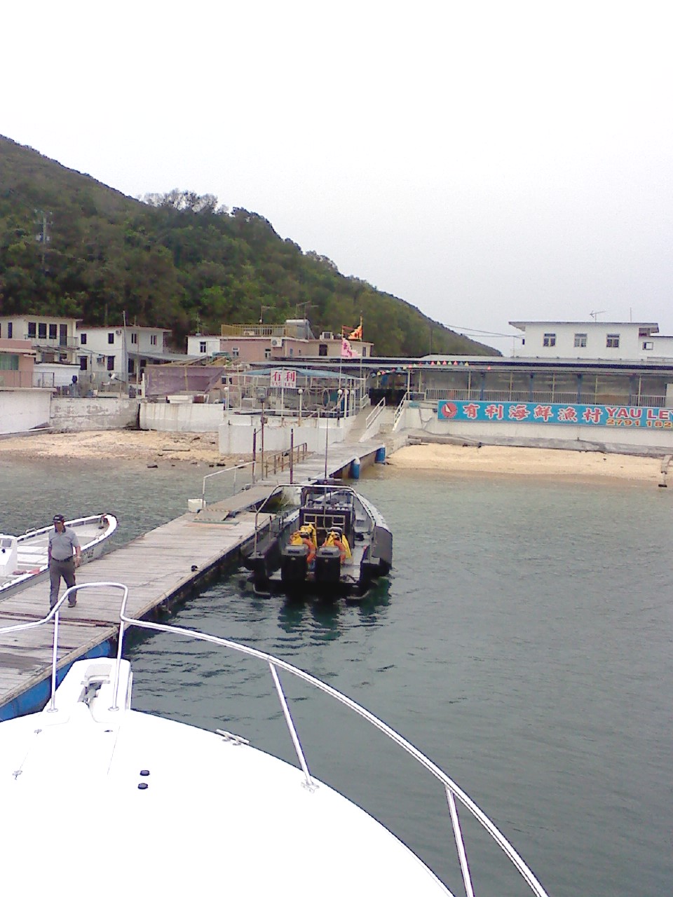 どこら辺なのかさっぱり見当つきませんが、香港のヨットハーバー『クリアウォーターベイ』から40分くらいだったでしょうか。正面の小さなレストランに車の横付けならぬ、船の横付けです。贅沢な朝飯ですわ。